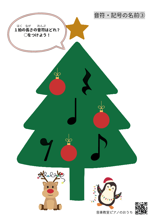 このプリントでは、1拍の長さの音符を探して○をつける練習をしましょう!