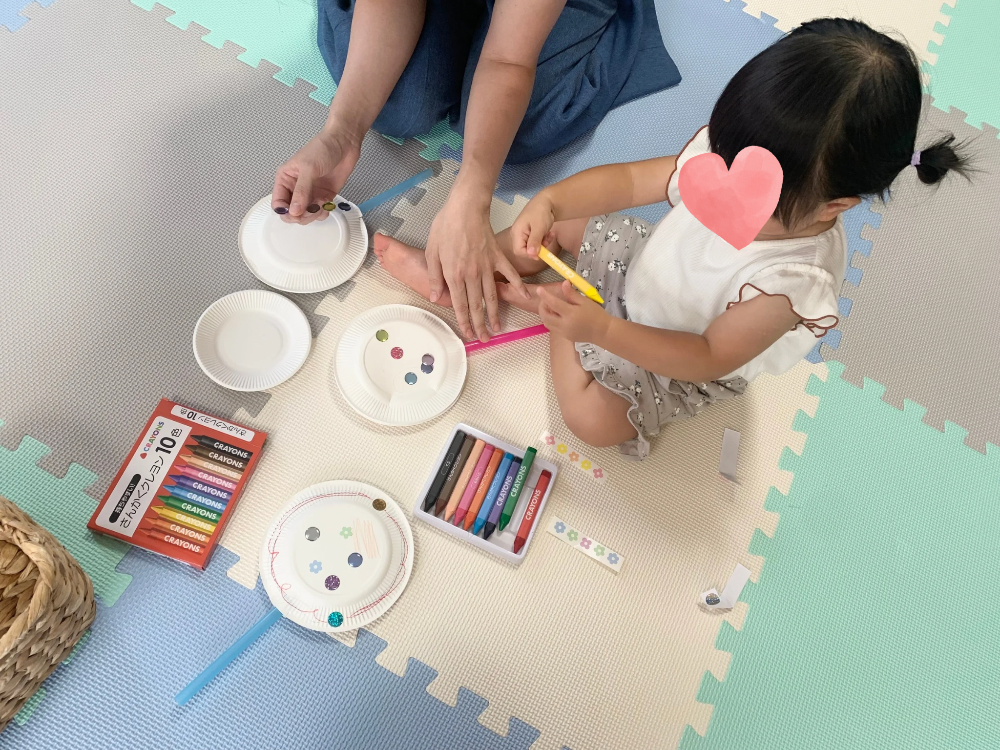 8月のリトミックでは、うちわの工作を行いました。いくつかの種類のシールを使い手触りに違いを楽しみました。